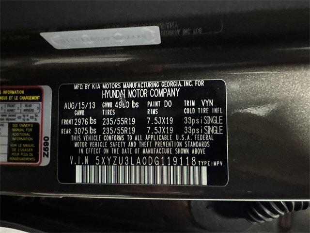 - VIN : 5XYZU3LA0DG119118