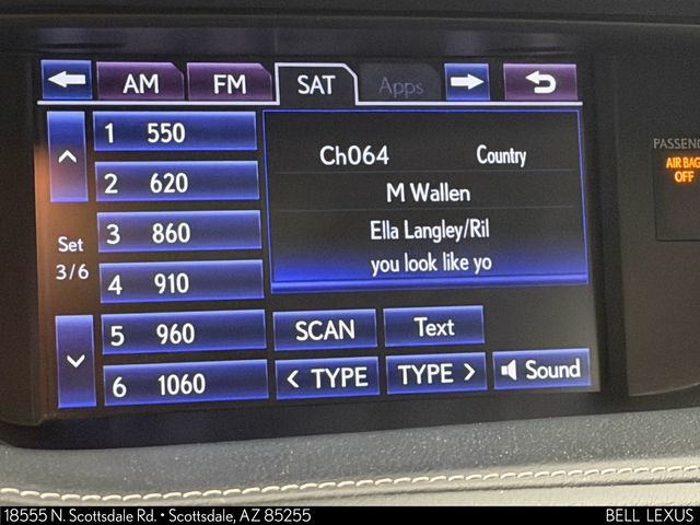 Arizona's Original and Largest Lexus Dealer, since 1989! ELITE OF LEXUS AWARD WINNER... for two decades. Bell Lexus is also the #1 Lexus dealer in the USA for Service Customer Satisfaction 6 out of the last 8 years. This Lexus ES is equipped with the following features: Black w/NuLuxe Interior or Leather Trimmed Interior or Semi-Aniline Leather Seat Trim, 10-Way Power Adjustable Front Seats, 17" x 7JJ Split 6-Spoke Aluminum Alloy Wheels, 4-Wheel Disc Brakes, 8 Speakers, ABS brakes, Air Conditioning, Alloy wheels, AM/FM radio: SiriusXM, Anti-whiplash front head restraints, Auto-dimming door mirrors, Auto-dimming Rear-View mirror, Automatic temperature control, Brake assist, Bumpers: body-color, CD player, Compass, Delay-off headlights, Driver door bin, Driver vanity mirror, Dual front impact airbags, Dual front side impact airbags, Electronic Stability Control, Emergency communication system: Safety Connect, Four wheel independent suspension, Front anti-roll bar, Front Bucket Seats, Front Center Armrest, Front dual zone A/C, Front fog lights, Front reading lights, Fully automatic headlights, Garage door transmitter: HomeLink, Heated door mirrors, Illuminated entry, Knee airbag, Low tire pressure warning, NuLuxe Interior, Occupant sensing airbag, Outside temperature display, Overhead airbag, Overhead console, Panic alarm, Passenger door bin, Passenger vanity mirror, Power door mirrors, Power driver seat, Power moonroof, Power passenger seat, Power steering, Power windows, Radio data system, Radio: AM/FM w/6-CD Changer w/MP3/WMA Capability, Rear anti-roll bar, Rear reading lights, Rear seat center armrest, Rear side impact airbag, Rear window defroster, Remote keyless entry, Security system, Speed control, Speed-sensing steering, Steering wheel mounted audio controls, Tachometer, Telescoping steering wheel, Tilt steering wheel, Traction control, Trip computer, Turn signal indicator mirrors, and Variably intermittent wipers.