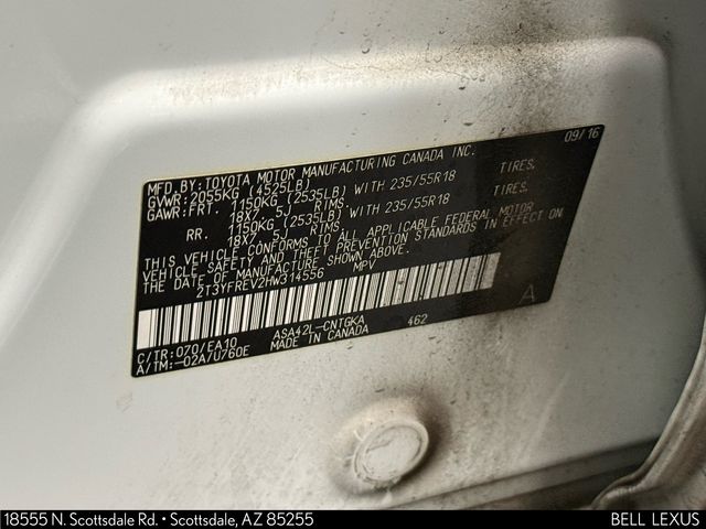 Arizona's Original and Largest Lexus Dealer, since 1989! ELITE OF LEXUS AWARD WINNER... for two decades. Bell Lexus is also the #1 Lexus dealer in the USA for Service Customer Satisfaction 6 out of the last 8 years. This Toyota RAV4 is equipped with the following features: Ash Premium Synthetic, 3.815 Axle Ratio, 4-Wheel Disc Brakes, 6 Speakers, ABS brakes, Air Conditioning, Alloy wheels, AM/FM radio: SiriusXM, Auto High-beam Headlights, Auto-dimming Rear-View mirror, Automatic temperature control, Brake assist, Bumpers: body-color, Chrome wheels, Compass, Driver door bin, Driver vanity mirror, Dual front impact airbags, Dual front side impact airbags, Electronic Stability Control, Exterior Parking Camera Rear, Four wheel independent suspension, Front anti-roll bar, Front Bucket Seats, Front Center Armrest, Front dual zone A/C, Front fog lights, Front reading lights, Fully automatic headlights, Garage door transmitter: HomeLink, Heated door mirrors, Heated front seats, Heated Front Sport Seats, Illuminated entry, Knee airbag, Leather Shift Knob, Leather steering wheel, Low tire pressure warning, Memory seat, Navigation System, Occupant sensing airbag, Outside temperature display, Overhead airbag, Overhead console, Panic alarm, Passenger door bin, Passenger vanity mirror, Power door mirrors, Power driver seat, Power Liftgate, Power moonroof, Power steering, Power windows, Radio data system, Radio: Entune Premium Audio with Navigation, Rear anti-roll bar, Rear seat center armrest, Rear window defroster, Rear window wiper, Remote keyless entry, Roof rack, SofTex Seat Trim, Speed control, Speed-sensing steering, Split folding rear seat, Spoiler, Steering wheel mounted audio controls, Tachometer, Telescoping steering wheel, Tilt steering wheel, Traction control, Trip computer, Turn signal indicator mirrors, Variably intermittent wipers, and Wheels: 18" Alloy ALM.