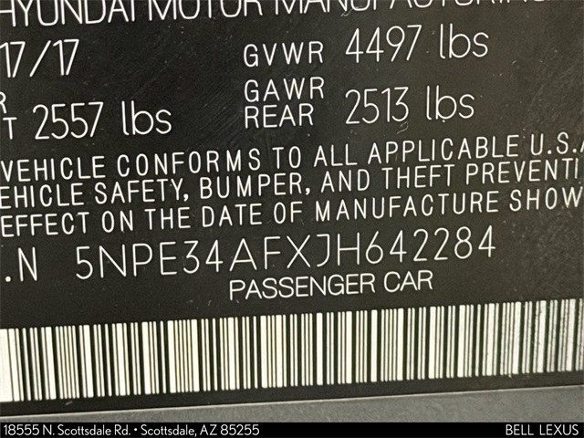 Arizona's Original and Largest Lexus Dealer, since 1989! ELITE OF LEXUS AWARD WINNER... for two decades. Bell Lexus is also the #1 Lexus dealer in the USA for Service Customer Satisfaction 6 out of the last 8 years. This Hyundai Sonata is equipped with the following features: Black w/Leather Bolster/Cloth Insert Seating Surfaces, 4-Wheel Disc Brakes, 6 Speakers, ABS brakes, Air Conditioning, Alloy wheels, AM/FM radio: SiriusXM, Apple CarPlay & Android Auto, Brake assist, Bumpers: body-color, Delay-off headlights, Driver door bin, Driver vanity mirror, Dual front impact airbags, Dual front side impact airbags, Electronic Stability Control, Emergency communication system: Blue Link, Exterior Parking Camera Rear, Four wheel independent suspension, Front anti-roll bar, Front Bucket Seats, Front Center Armrest, Front reading lights, Fully automatic headlights, Heated door mirrors, Heated Front Bucket Seats, Heated front seats, Illuminated entry, Knee airbag, Leather Shift Knob, Leather steering wheel, Low tire pressure warning, Occupant sensing airbag, Outside temperature display, Overhead airbag, Overhead console, Panic alarm, Passenger door bin, Passenger vanity mirror, Power door mirrors, Power driver seat, Power steering, Power windows, Radio data system, Radio: AM/FM/HD/SiriusXM/MP3 Display Audio, Rear anti-roll bar, Rear seat center armrest, Rear window defroster, Remote keyless entry, Security system, Speed control, Speed-sensing steering, Speed-Sensitive Wipers, Split folding rear seat, Steering wheel mounted audio controls, Tachometer, Telescoping steering wheel, Tilt steering wheel, Traction control, Trip computer, Turn signal indicator mirrors, Variably intermittent wipers, Wheels: 17 x 7.0J Aluminum Alloy, and YES Essentials Premium Cloth Seating Surfaces.