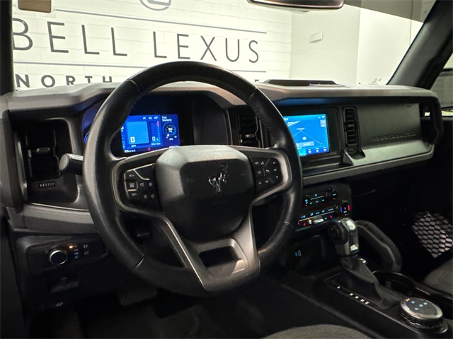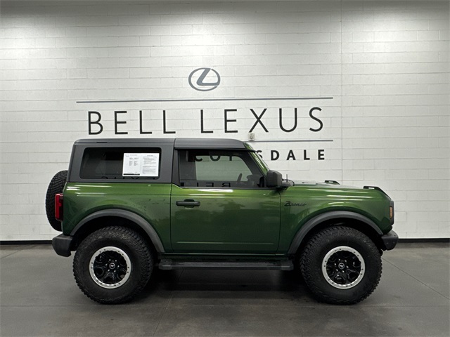 Arizona's Original and Largest Lexus Dealer, since 1989! ELITE OF LEXUS AWARD WINNER... for two decades. Bell Lexus is also the #1 Lexus dealer in the USA for Service Customer Satisfaction 6 out of the last 8 years. This Ford Bronco is equipped with the following features: Equipment Group 222A Mid Package (2-Door Intelligent Access w/Lock/Unlock, Ambient Footwell Lighting, Auto-Dimming Interior Rear-View Mirror, Connected Navigation, Dr & Pass Illuminated Sliding Visor Vanity Mirrors, Dual-Zone Electronic Automatic Temperature Control, Enhanced Voice Recognition, Front Row Heated Seats, Power Outlet - Back Side of Center Floor Console, Rear Parking Sensors, and Remote Start System), 4-Wheel Disc Brakes, 4.46 Axle Ratio, 6 Speakers, ABS brakes, Air Conditioning, Alloy wheels, AM/FM radio: SiriusXM with 360L, AM/FM Stereo, Auto High-beam Headlights, Auxiliary Switches, Brake assist, Cloth Bucket Seats, Compass, Convertible HardTop, Convertible roof lining, Delay-off headlights, Driver door bin, Driver vanity mirror, Dual front impact airbags, Dual front side impact airbags, Electronic Stability Control, Emergency communication system: 911 Assist, Exterior Parking Camera Rear, Ford Performance Heavy-Duty Modular Front Bumper, Front & Rear Floor Liners, Front anti-roll bar, Front Bucket Seats, Front Center Armrest, Front fog lights, Front reading lights, Front wheel independent suspension, Fully automatic headlights, Glass rear window, Heated door mirrors, Illuminated entry, Integrated roll-over protection, Keyless Entry Keypad, Leather Shift Knob, Low tire pressure warning, Occupant sensing airbag, On-Road Assistance Kit (DIO), Outside temperature display, Overhead airbag, Overhead console, Panic alarm, Passenger door bin, Passenger vanity mirror, Power door mirrors, Power steering, Power windows, Radio data system, Rear window defroster, Rear window wiper, Remote keyless entry, Security system, SiriusXM Radio w/360L, Speed control, Split folding rear seat, Steering wheel mounted audio controls, SYNC 4, Tachometer, Telescoping steering wheel, Tilt steering wheel, Towing Capability, Traction control, Trip computer, Variably intermittent wipers, and Wheels: 17" Carbonized Gray-Painted Aluminum.