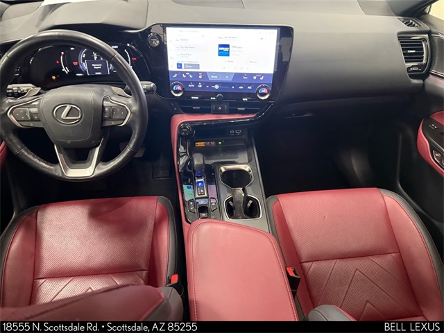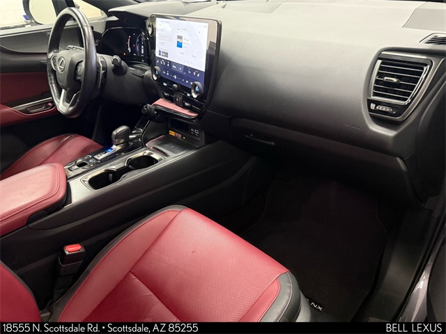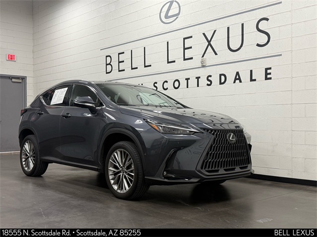Arizona's Original and Largest Lexus Dealer, since 1989! ELITE OF LEXUS AWARD WINNER... for two decades. Bell Lexus is also the #1 Lexus dealer in the USA for Service Customer Satisfaction 6 out of the last 8 years. This Lexus NX is equipped with the following features: Luxury Package (14" Display Navigation, Auto Dynamic Headlamp Leveling, Auto Rain Sensing Windshield Wipers, Front Door Courtesy Lamp, Heads-Up Display, Kick Auto Open/Close Door, Parking Support Alert/Brake, Power Steering Column, Wireless Smart Door Lock, and Wood Door Trim), L/Certified Certified, 2.5L I4 DOHC 16V, Mark Levinson, Panoramic Slide Moonroof/Sunroof, 10 Speakers, 20" Wheels, 4-Wheel Disc Brakes, ABS brakes, Active Cruise Control, Air Conditioning, AM/FM radio: SiriusXM, Anti-whiplash front head restraints, Auto High-beam Headlights, Auto tilt-away steering wheel, Auto-dimming door mirrors, Auto-dimming Rear-View mirror, Automatic temperature control, Axle Ratio: 10.781, Brake assist, Bumpers: body-color, Delay-off headlights, Driver door bin, Driver vanity mirror, Dual front impact airbags, Dual front side impact airbags, Electronic Stability Control, Emergency communication system: Safety Connect, Exterior Parking Camera Rear, Four wheel independent suspension, Front anti-roll bar, Front Bucket Seats, Front Center Armrest, Front dual zone A/C, Front fog lights, Front reading lights, Fully automatic headlights, Garage door transmitter: HomeLink, Genuine wood door panel insert, Heated & Ventilated Front Bucket Seats, Heated door mirrors, Heated front seats, Illuminated entry, Knee airbag, Leather Seat Trim, Leather Shift Knob, Low tire pressure warning, Memory seat, Navigation System, Navigation system: Drive Connect Cloud Navigation (subscription required), Occupant sensing airbag, Outside temperature display, Overhead airbag, Overhead console, Panic alarm, Passenger door bin, Passenger vanity mirror, Power door mirrors, Power driver seat, Power Liftgate, Power passenger seat, Power steering, Power windows, Radio data system, Radio: 10-Speaker Sound System, Rain sensing wipers, Rear anti-roll bar, Rear reading lights, Rear seat center armrest, Rear window defroster, Rear window wiper, Remote keyless entry, Roof rack: rails only, Security system, Speed control, Speed-sensing steering, Speed-Sensitive Wipers, Split folding rear seat, Spoiler, Steering wheel memory, Steering wheel mounted audio controls, Tachometer, Telescoping steering wheel, Tilt steering wheel, Traction control, Trip computer, Turn signal indicator mirrors, Variably intermittent wipers, Ventilated front seats, and Wireless Apple CarPlay/Wireless Android Auto.