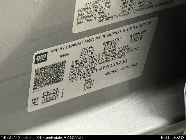 Arizona's Original and Largest Lexus Dealer, since 1989! ELITE OF LEXUS AWARD WINNER... for two decades. Bell Lexus is also the #1 Lexus dealer in the USA for Service Customer Satisfaction 6 out of the last 8 years. This GMC Sierra 1500 is equipped with the following features: Denali Reserve Package (Wheels: 22" x 9" Painted Aluminum, GMC MultiPro Power Steps, and Power Sunroof), Preferred Equipment Group 5SA (120-Volt Bed Mounted Power Outlet, 120-Volt Interior Power Outlet, 170 Amp Alternator, 2 Charge/Data USB Ports Inside Center Console, 2 Type-C Charge-Only Rear USB Ports, 2 USB Ports, Auto-Locking Rear Differential, Auxiliary External Transmission Oil Cooler, Bed View Camera, Chrome Header with Signature Denali Chrome Grille, Chrome Recovery Hooks, Chrome Wheel to Wheel Assist Steps, Color-Keyed Carpeting Floor Covering, Deep-Tinted Glass, Denali Premium Suspension with Adaptive Ride Control, Electric Rear-Window Defogger, Floor-Mounted Center Console, Front Rain-Sensing Wipers, HD Surround Vision, Heated 2nd Row Outboard Seats, Heated Driver and Front Outboard Passenger Seating, Heavy-Duty Air Filter, Hill Descent Control, Hitch View, in-Vehicle Trailering System App, Integrated Trailer Brake Controller, Keyless Open and Start, LED Cargo Area Lighting, OnStar Services Capable, Perimeter Lighting, Power Door Locks, Power Front Passenger Windows with Express Up/Down, Power Front Windows with Driver Express Up/Down, Power Rake and Telescoping Steering Column, Power Rear Windows with Express Down, Power Sliding Rear Window with Rear Defogger, Premium Bose 7-Speaker Sound System, Push Button Start, Rear Cross Traffic Braking, Rear Pedestrian Detection, Rear Wheelhouse Liners, Remote Vehicle Starter System, SiriusXM with 360L Trial Subscription, Spray-on Pickup Bedliner with GMC Logo, Steering Wheel Audio Controls, Theft Deterrent System (unauthorized Entry), Trailer Camera Provisions, Trailer Side Blind Zone Alert, Ultrasonic Front and Rear Park Assist, Universal Home Remote, Ventilated Driver and Front Passenger Seats, Wi-Fi Hotspot Capable, and Wireless Charging), Technology Package (Multicolor 15" Diagonal Head-Up Display and Rear Camera Mirror), Trailering Package (Hitch Guidance), 10-Speed Automatic, 4WD, Black Leather, 12-Way Power Driver Seat Adjuster with Lumbar, 12-Way Power Passenger Seat Adjuster with Lumbar, 3.23 Rear Axle Ratio, 4-Wheel Disc Brakes, 7 Speakers, ABS brakes, Adaptive suspension, Air Conditioning, Alloy wheels, AM/FM radio: SiriusXM with 360L, Apple CarPlay/Android Auto, Auto High-beam Headlights, Auto-dimming door mirrors, Auto-dimming Rear-View mirror, Automatic temperature control, Brake assist, Buckle to Drive, Bumpers: body-color, Compass, Delay-off headlights, Driver door bin, Driver Memory, Driver vanity mirror, Dual Active Exhaust, Dual front impact airbags, Dual front side impact airbags, Electronic Stability Control, Emergency communication system: OnStar, Enhanced Automatic Emergency Braking, Following Distance Indicator, Forge Perforated Leather Seat Trim, Forward Collision Alert, Front anti-roll bar, Front Bucket Seats, Front Center Armrest, Front dual zone A/C, Front fog lights, Front Pedestrian Braking, Front reading lights, Front wheel independent suspension, Fully automatic headlights, Garage door transmitter, Genuine wood console insert, Genuine wood dashboard insert, Genuine wood door panel insert, Heated door mirrors, Heated front seats, Heated rear seats, Heated steering wheel, Illuminated entry, IntelliBeam Automatic High Beam on/Off, Lane Keep Assist with Lane Departure Warning, Low tire pressure warning, Memory seat, Navigation Syste